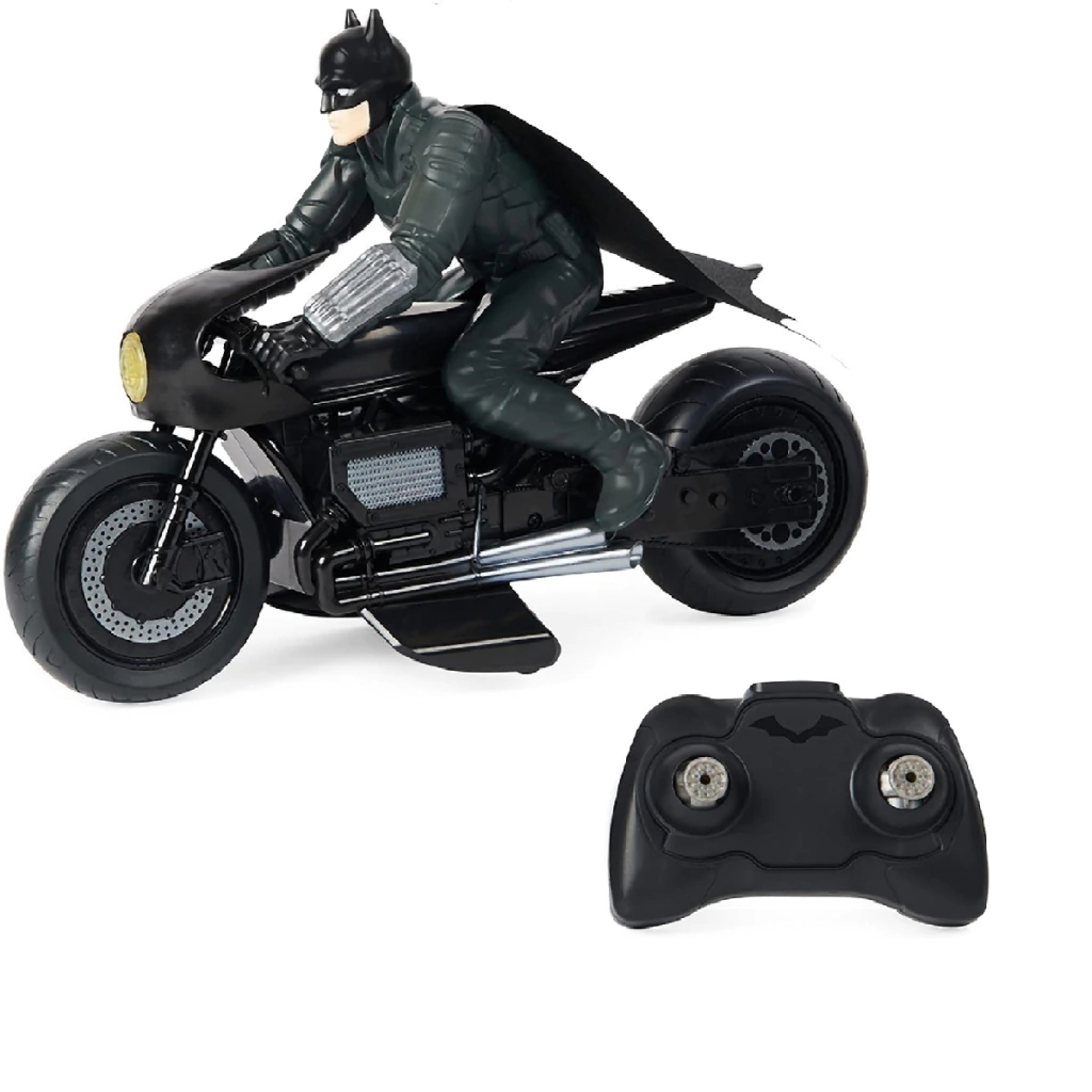 BATCYCLE RC: Corre en Gotham City con la RC Batcycle. Este vehículo con control remoto cuenta con un control remoto fácil de conducir, un estilo de película auténtico, faros que funcionan y una figura fija del conductor de Batman.