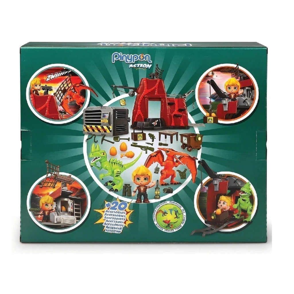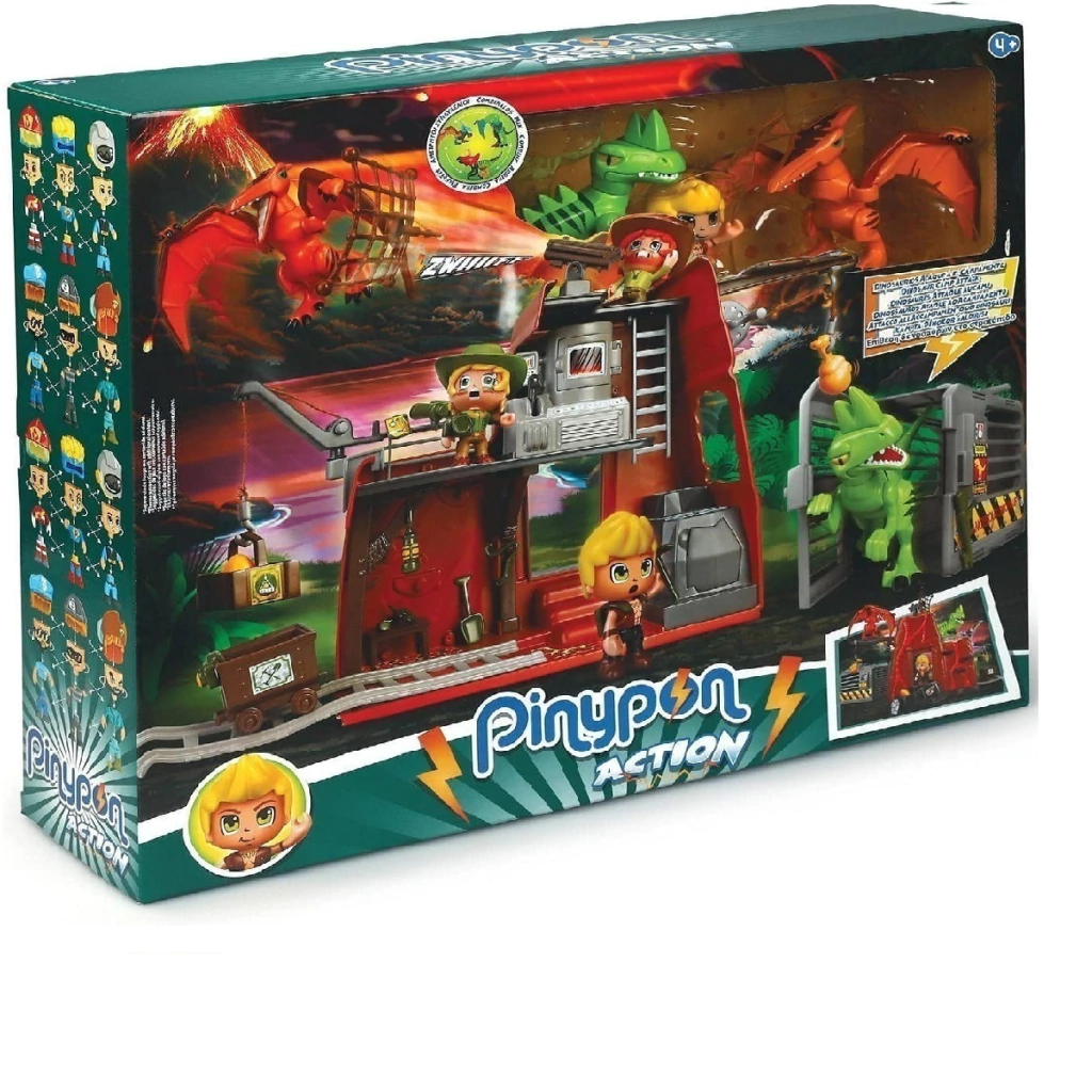 El juguete incluye una figura de un muñeco Pinypon Action explorador de la selva, y dos dinosaurios como un Pterodáctilo. Las figuras tienen piezas intercambiables entre sí y con otras figuras de Pinypon Action