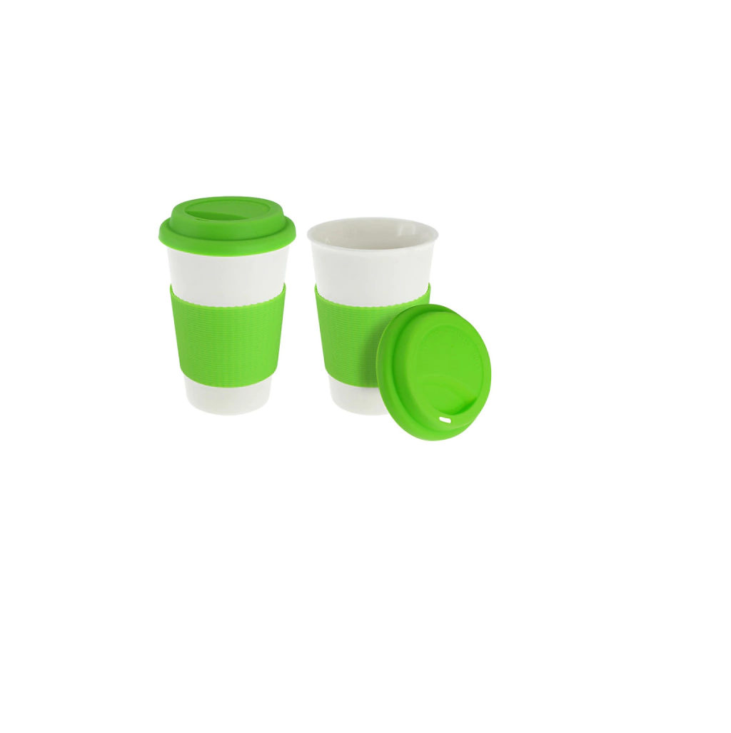 Vaso cerámico blanco de 400ml, con tapa y grip (mango) texturado de silicona de color. Presentación en caja